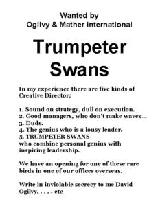 David Ogilvy’s insistence on getting good people on board was well illustrated in the well-known ad calling for Trumpeter Swans came in. This is how it went.